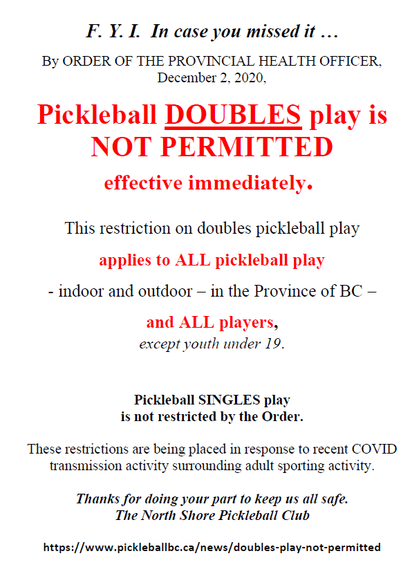 As of January 1, 2021 Parkgate, Delbrook, Gleneagles and West Vancouver Community Centers are now offering court time for pickleball SINGLES play.