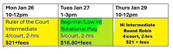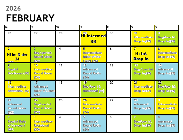 Round Robin – Players are randomly assigned a number and then assigned to a court for a 15-minute game. Scores are not kept and players are assigned to the next game by their number.